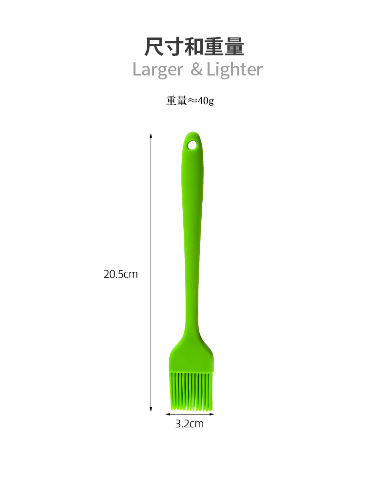 計,防滑穩當,有效加長圓弧手柄的設防止被燙傷,硅膠條刷它還彈性十足,不變形,使用時不會掉落,柔軟的刷毛,密集均勻排布,能均勻的涂抹食物,柔韌性好又耐用。